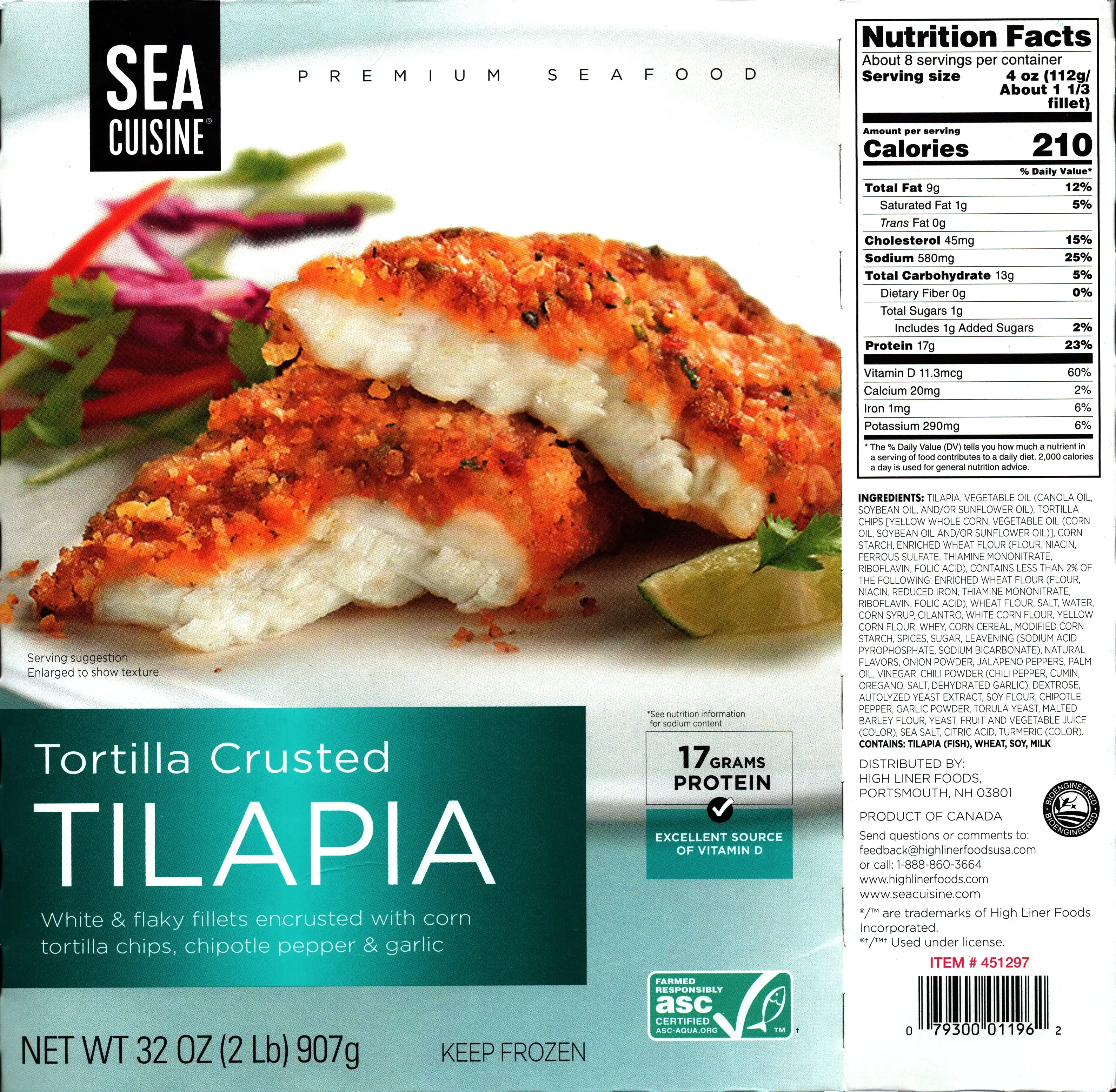 INGREDIENTS: TILAPIA, VEGETABLE OIL (CANOLA OIL, SOYBEAN OIL, AND/OR SUNFLOWER OIL), TORTILLA CHIPS [YELLOW WHOLE CORN, VEGETABLE OIL (CORN OIL, SOYBEAN OIL AND/OR SUNFLOWER OIL)], CORN STARCH, ENRICHED WHEAT FLOUR (FLOUR, NIACIN, FERROUS SULFATE, THIAMINE MONONITRATE, RIBOFLAVIN, FOLIC ACID), CONTAINS LESS THAN 2% OF THE FOLLOWING: ENRICHED WHEAT FLOUR (FLOUR, NIACIN, REDUCED IRON, THIAMINE MONONITRATE, RIBOFLAVIN, FOLIC ACID, WHEAT FLOUR, SALT, WATER, CORN SYRUP, CILANTRO, WHITE CORN FLOUR, YELLOW CORN FLOUR, WHEY, CORN CEREAL, MODIFIED CORN STARCH, SPICES, SUGAR, LEAVENING (SODIUM ACID PYROPHOSPHATE, SODIUM BICARBONATE), NATURAL FLAVORS, ONION POWDER, JALAPENO PEPPERS, PALM OIL, VINEGAR, CHILI POWDER (CHILI PEPPER, CUMIN, OREGANO, SALT, DEHYDRATED GARLIC), DEXTROSE, AUTOLYZED YEAST EXTRACT, SOY FLOUR, CHIPOTLE PEPPER, GARLIC POWDER, TORULA YEAST, MALTED BARLEY FLOUR, YEAST, FRUIT AND VEGETABLE JUICE (COLOR), SEA SALT, CITRIC ACID, TURMERIC (COLOR). CONTAINS: TILAPIA (FISH), WHEAT, SOY, MILK