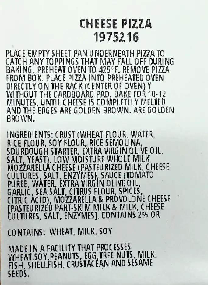 INGREDIENTS: CRUST (WHEAT FLOUR, WATER, RICE FLOUR, SOY FLOUR, RICE SEMOLINA, SOURDOUGH STARTER, EXTRA VIRGIN OLIVE OIL. SALT, YEAST) LOW MOISTURE WHOLE MILK MOZZARELLA CHEESE (PASTEURIZED MILK, CHEESE CULTURES, SALT, ENZYMES), SAUCE, (TOMATO PUREE, WATER, EXTRA VIRGIN OLIVE OIL, GARLIC, SEA SALT, CITRUS FLOUR, SPICES, CITRIC ACID) MOZZARELLA & PROVOLONE CHEESE [PASTEURIZED PART-SKIM MILK & MILK, CHEESE CULTURES, SALT, ENZYMES], CONTAINS 2% OR