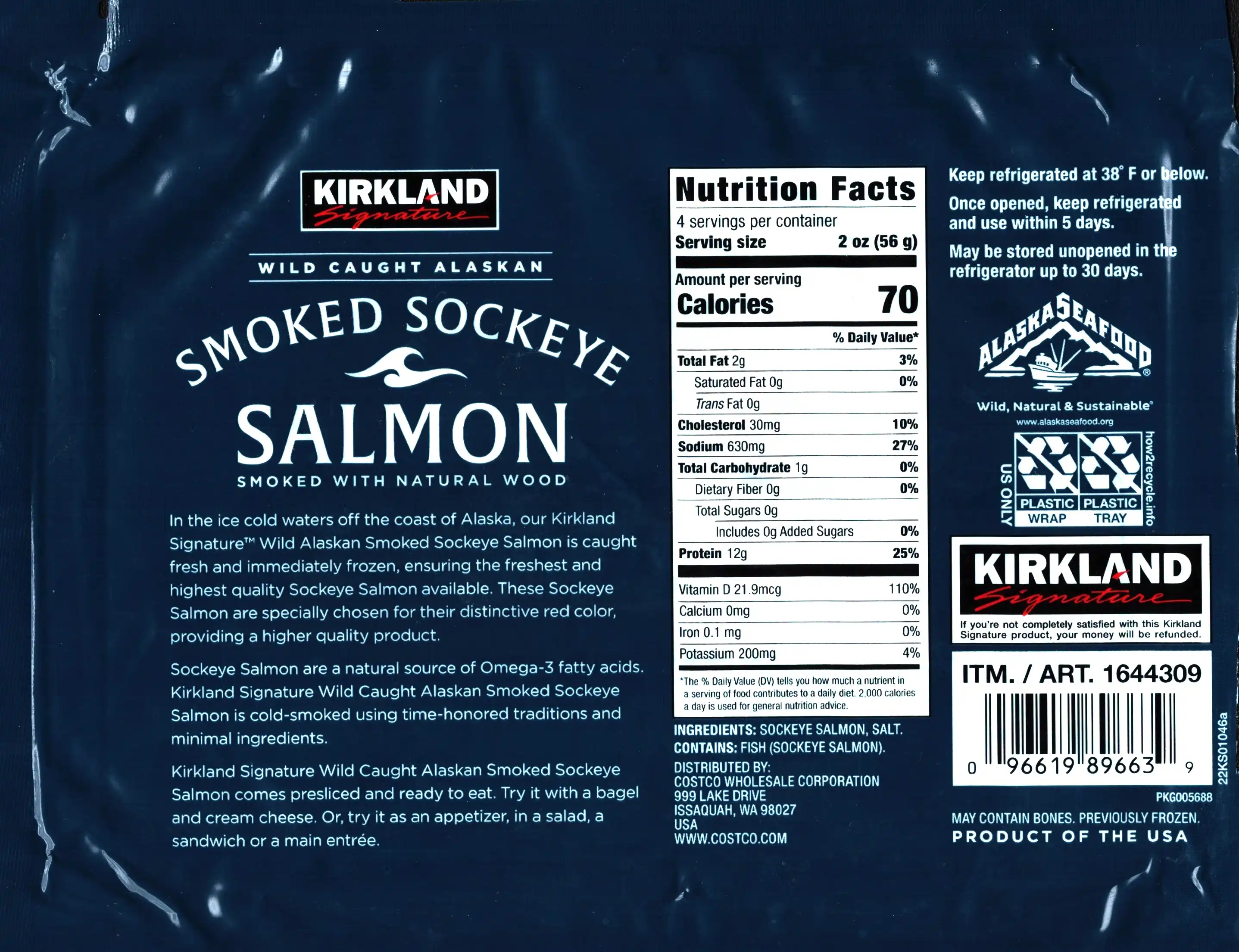In the ice cold waters off the coast of Alaska, our Kirkland Signature™ Wild Alaskan Smoked Sockeye Salmon is caught fresh and immediately frozen, ensuring the freshest and highest quality Sockeye Salmon available. These Sockeye Salmon are specially chosen for their distinctive red color, providing a higher quality product. Sockeye Salmon are a natural source of Omega-3 fatty acids Kirkland Signature Wild Caught Alaskan Smoked Sockeye Salmon is cold-smoked using time-honored traditions and minimal ingredients. Kirkland Signature Wild Caught Alaskan Smoked Sockeye Salmon comes presliced and ready to eat. Try it with a bagel and cream cheese. Or, try it as an appetizer, in a salad, a sandwich or a main entrée.