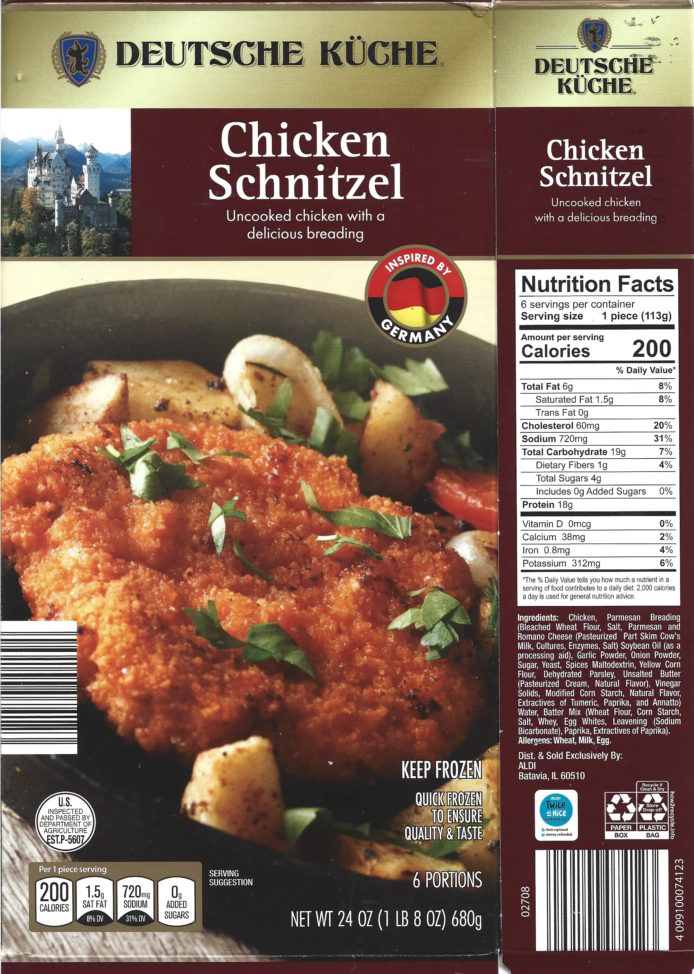 Ingredients: Chicken, Parmesan Breading (Bleached Wheat Flour, Salt, Parmesan and Romano Cheese Pasteurized Part Skim Cow's Milk, Cultures, Enzymes, Salt) Soybean Oil (as a processing aid), Garlic Powder, Onion Powder, Sugar, Yeast, Spices Maltodextrin, Yellow Corn Flour, Dehydrated Parsley, Unsalted Butter (Pasteurized Cream, Natural Flavor), Vinegar Solids, Modified Corn Starch, Natural Flavor, Extractives of Tumeric, Paprika, and Annatto) Water, Batter Mix (Wheat Flour, Corn Starch, Salt, Whey, Egg Whites, Leavening (Sodium Bicarbonate), Paprika, Extractives of Paprika). Allergens: Wheat, Milk, Egg.