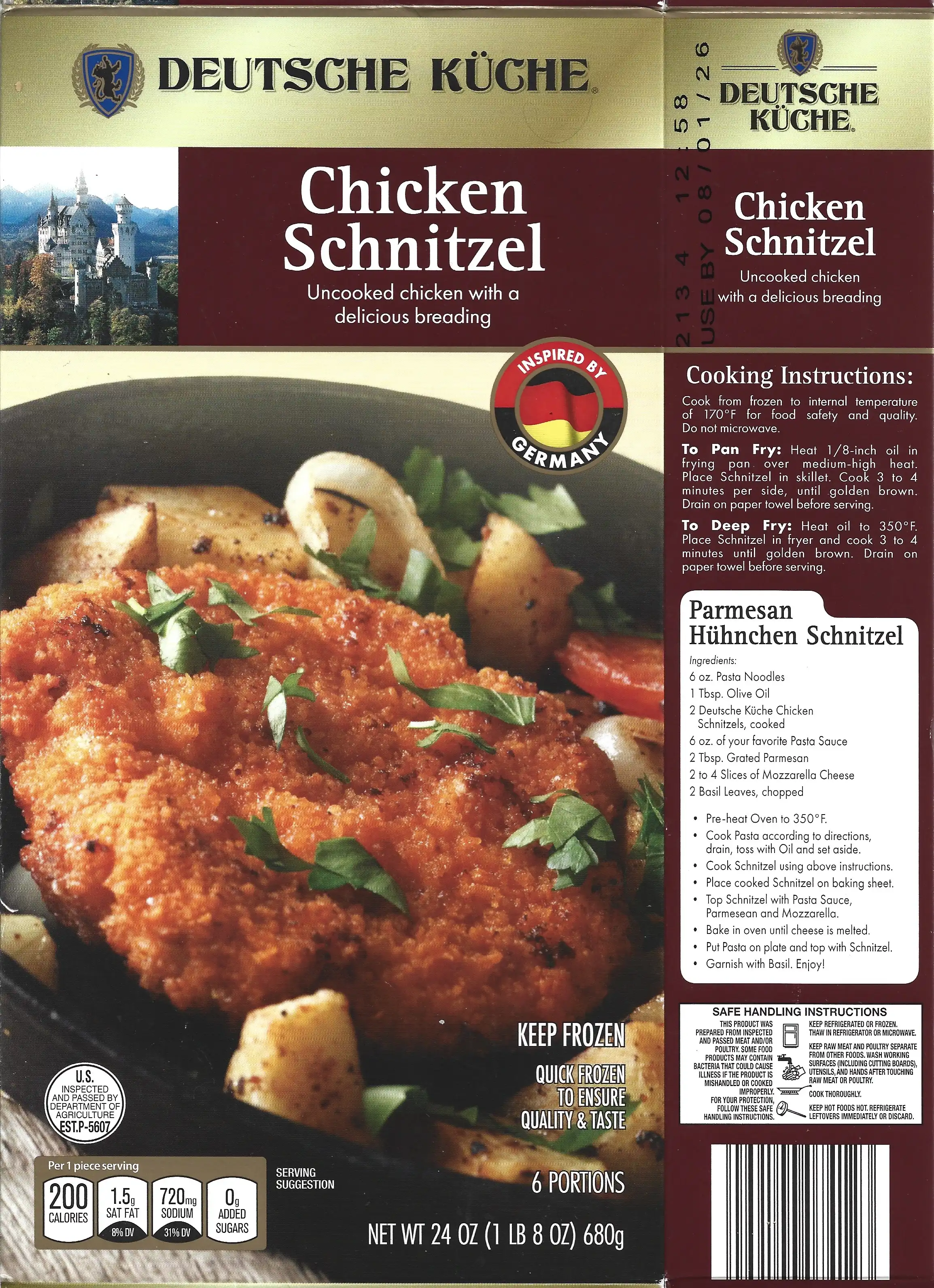 To Deep Fry: Heat oil to 350%F. Place Schnitzel in fryer and cook 3 to 4 minutes until golden brown. Drain on aper towel before serving.