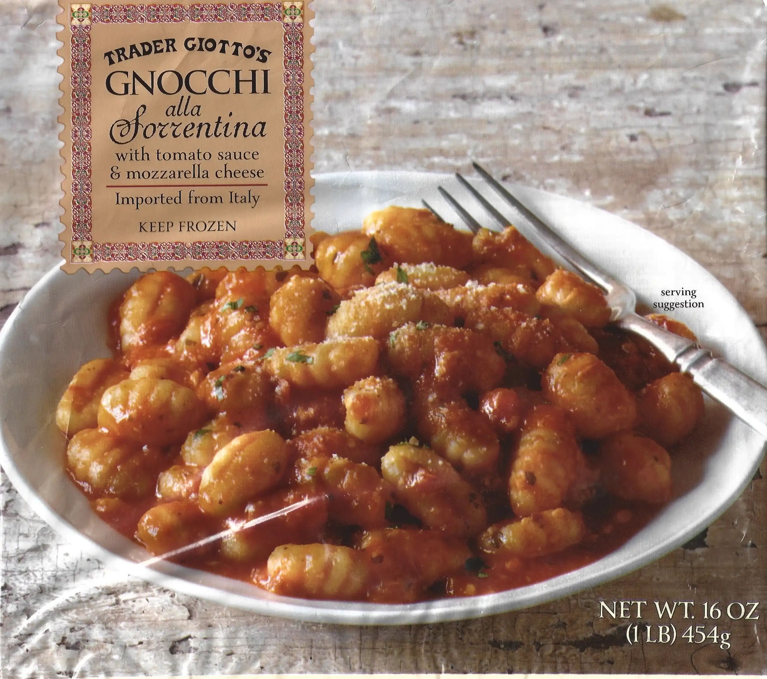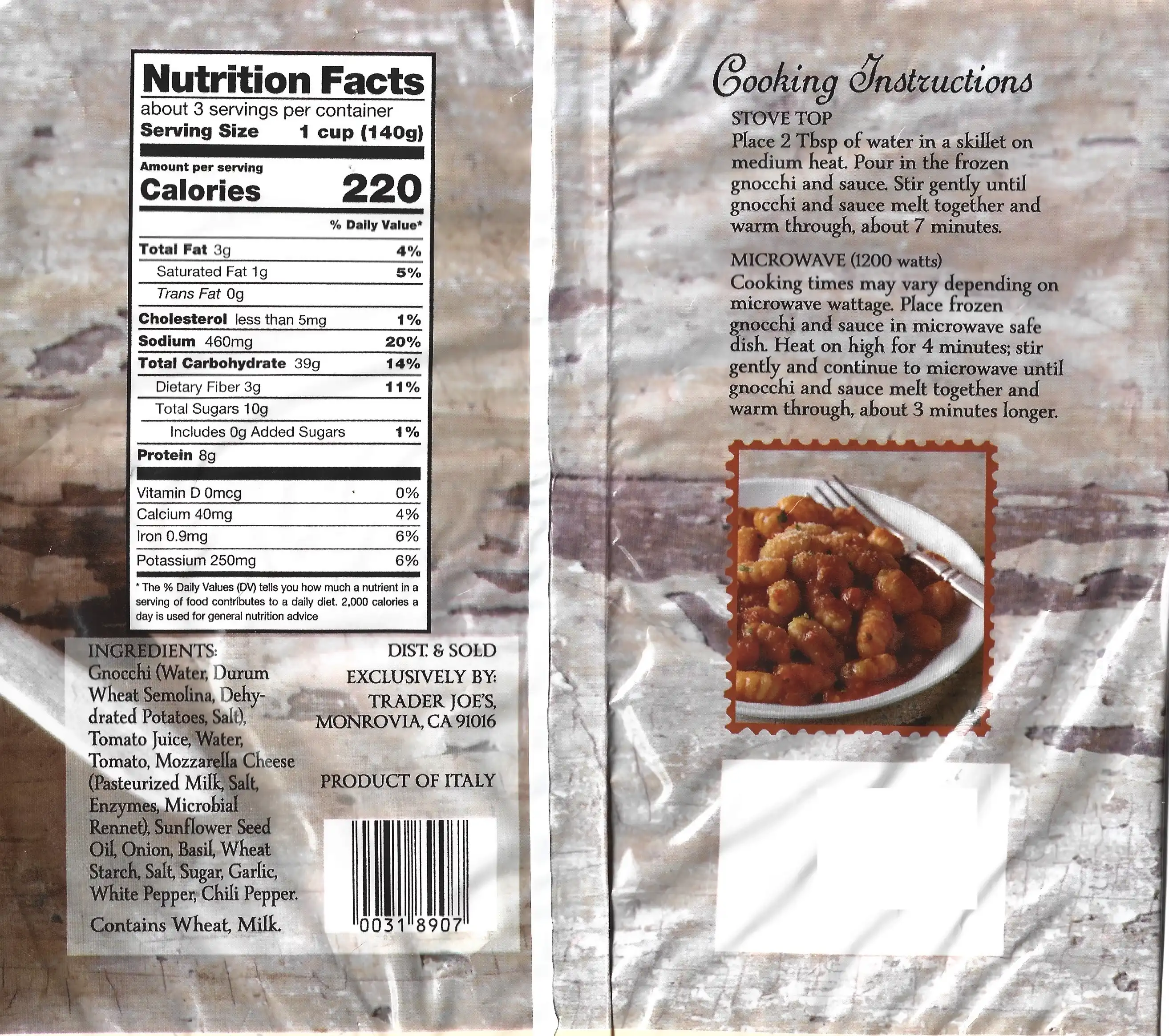 INGREDIENTS: Gnocchi (Water, Durum Wheat Semolina, Dehydrated Potatoes, Salt), Tomato Juice, Water, Tomato, Mozzarella Cheese (Pasteurized Milk, Salt, Enzymes, Microbial Rennet), Sunflower Seed Oil, Onion, Basil, Wheat Starch, Salt, Sugar, Garlic, White Pepper, Chili Pepper. Contains Wheat, Milk.