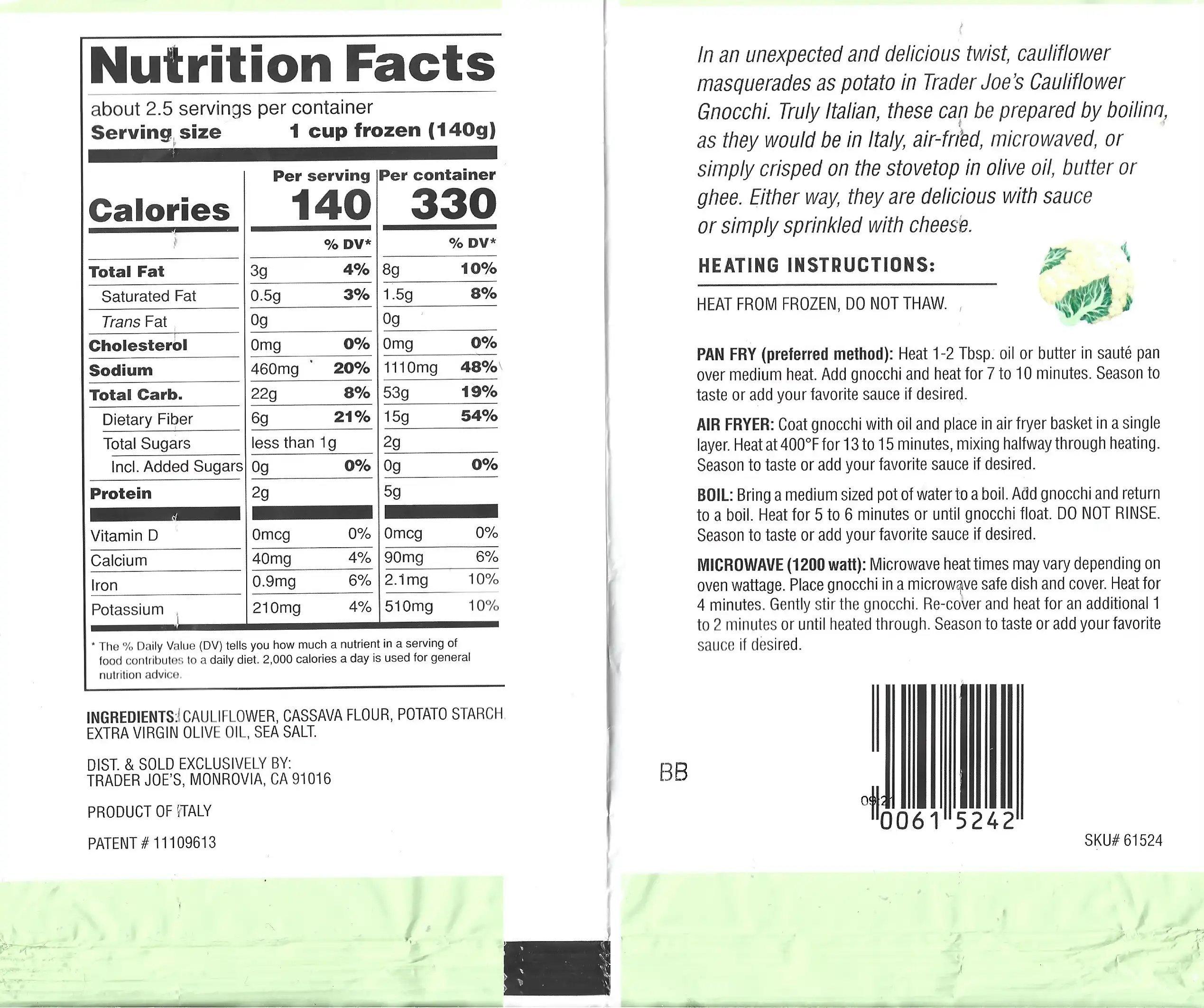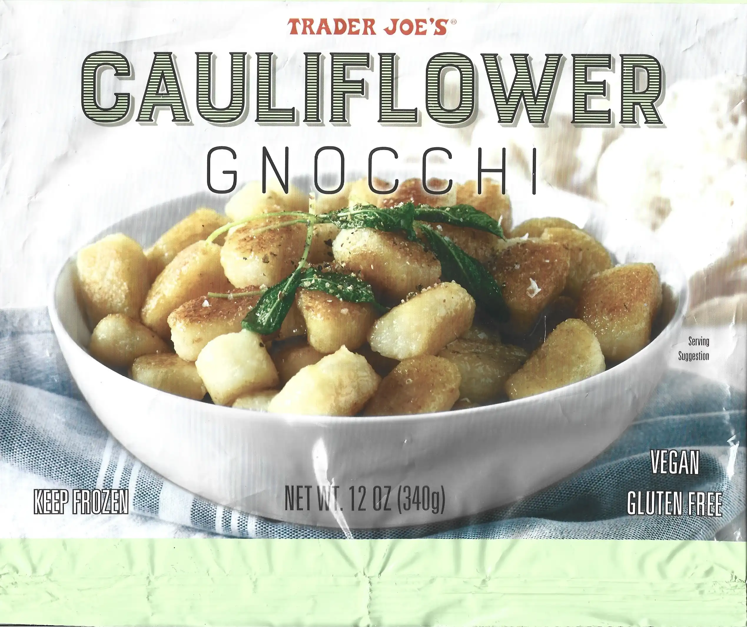 In an unexpected and delicious twist, cauliflower masquerades as potato in Trader Joe's Cauliflower Gnocchi. Truly Italian, these can be prepared by boiling, as they would be in Italy, air-fried, microwaved, or simply crisped on the stovetop in olive oil, butter or ghee. Either way, they are delicious with sauce or simply sprinkled with cheese.