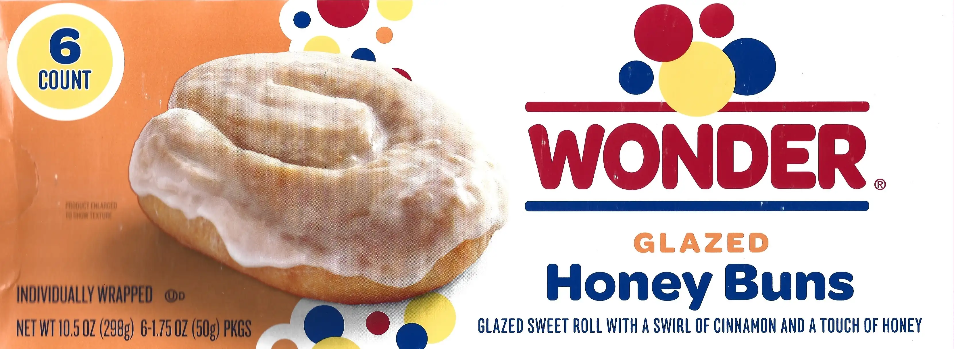 INGREDIENTS: UNBLEACHED ENRICHED FLOUR (WHEAT FLOUR, MALTED BARLEY FLOUR, NIACIN, REDUCED IRON, THIAMIN MONONITRATE, RIBOFLAVIN, FOLIC ACID), SUGAR, WATER, VEGETABLE OIL (PALM OIL AND SOYBEAN OIL), CONTAINS 2% OR LESS OF EACH OF THE FOLLOWING: YEAST, CINNAMON, DEXTROSE, CORN STARCH, MONOGLYCERIDES SALT, CALCIUM CARBONATE, SOY FLOUR, LEAVENING (SODIUM ACID PYROPHOSPHATE, SODIUM BICARBONATE), AGAR, ENZYMES, SOY LECITHIN, WHEAT FLOUR, TITANIUM DIOXIDE (COLOR), DATEM, ASCORBIC ACID, CALCIUM SULFATE, COLORED WITH TURMERIC AND ANNATTO, DRY HONEY, WHEAT STARCH, NATURAL AND ARTIFICIAL FLAVOR, PRESERVED WITH CALCIUM PROPIONATE, SODIUM PROPIONATE AND POTASSIUM SORBATE.