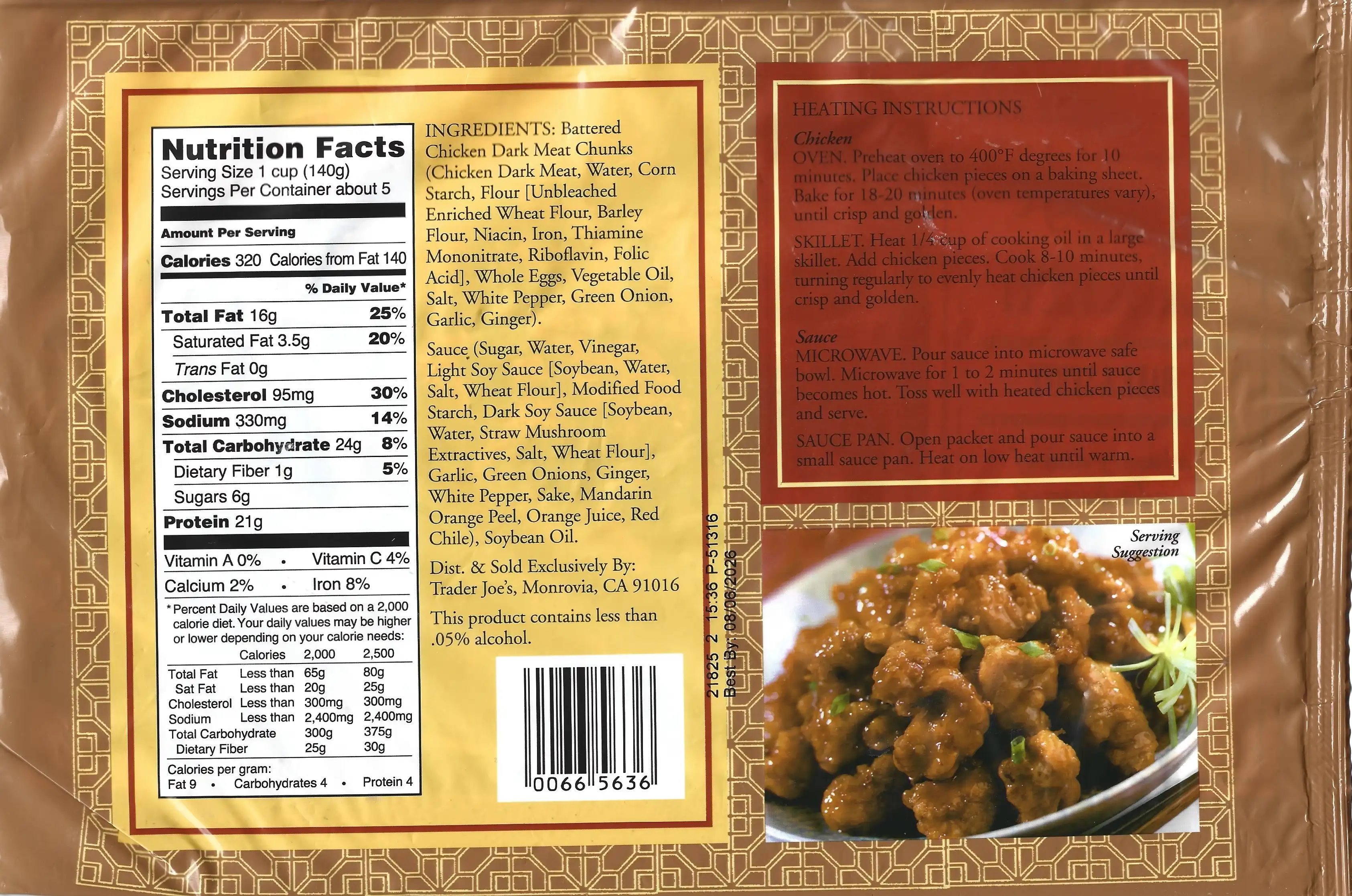 INGREDIENTS: Battered Chicken Dark Meat Chunks (Chicken Dark Meat, Water, Corn Starch, Flour [Unbleached Enriched Wheat Flour, Barley Flour, Niacin, Iron, Thiamine Mononitrate, Riboflavin, Folic Acid], Whole Eggs, Vegetable Oil, Salt, White Pepper, Green Onion, Garlic, Ginger). Sauce (Sugar, Water, Vinegar, Light Soy Sauce [Soybean, Water, Salt, Wheat Flour], Modified Food Starch, Dark Soy Sauce [Soybean, Water, Straw Mushroom Extractives, Salt, Wheat Flour], Garlic, Green Onions, Ginger, White Pepper, Sake, Mandarin Orange Peel, Orange Juice, Red Chile), Soybean Oil. Dist. & Sold Exclusively By: Trader Joe's, Monrovia, CA 91016 This product contains less than .05% alcohol.