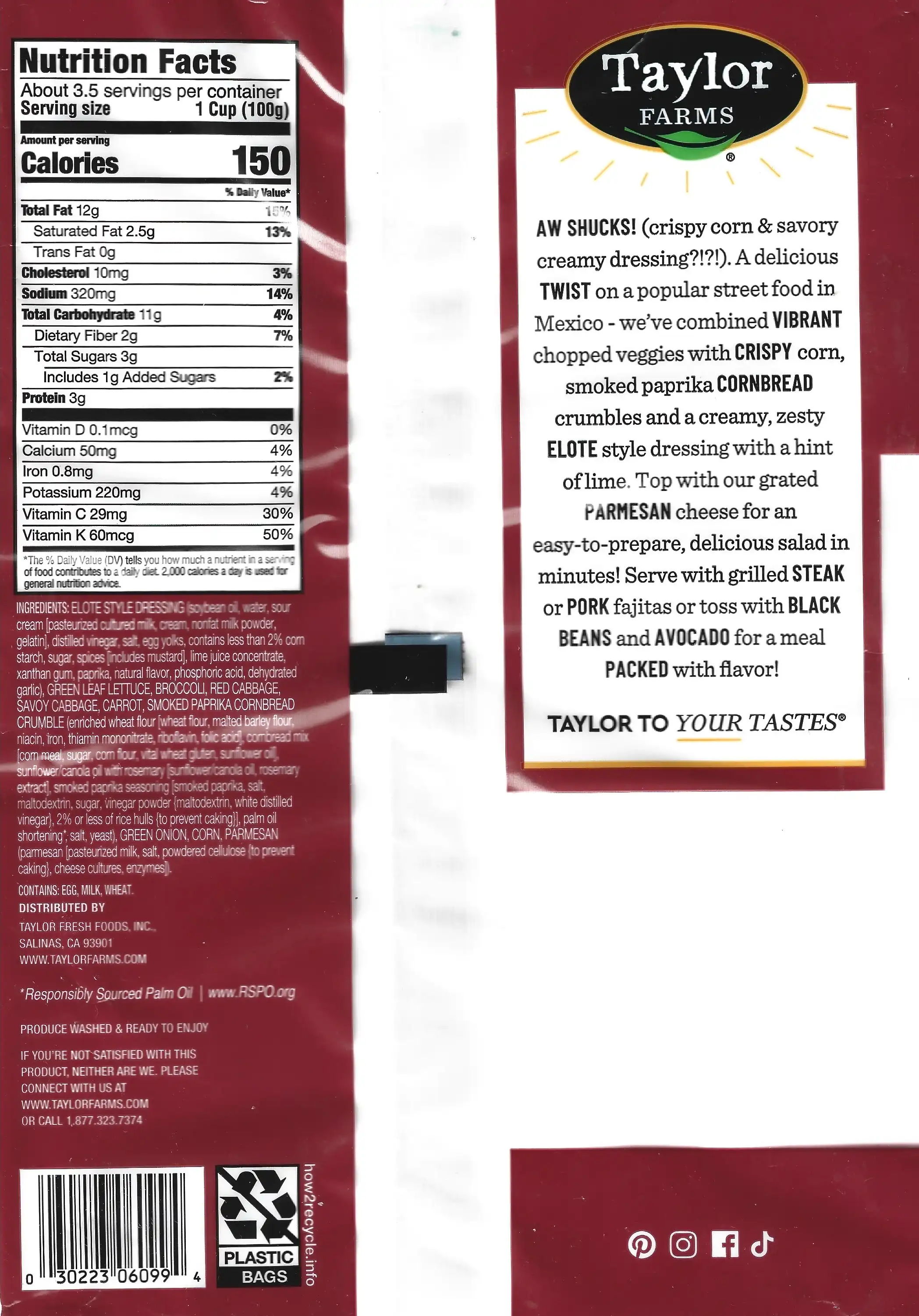 PRODUCE WASHED & READY TO ENJOY IF YOU'RE NOT SATISFIED WITH THIS PRODUCT, NEITHER ARE WE. PLEASE CONNECT WITH US AT WWW.TAYLORFARMS.COM OR CALL 1.877.323.7374